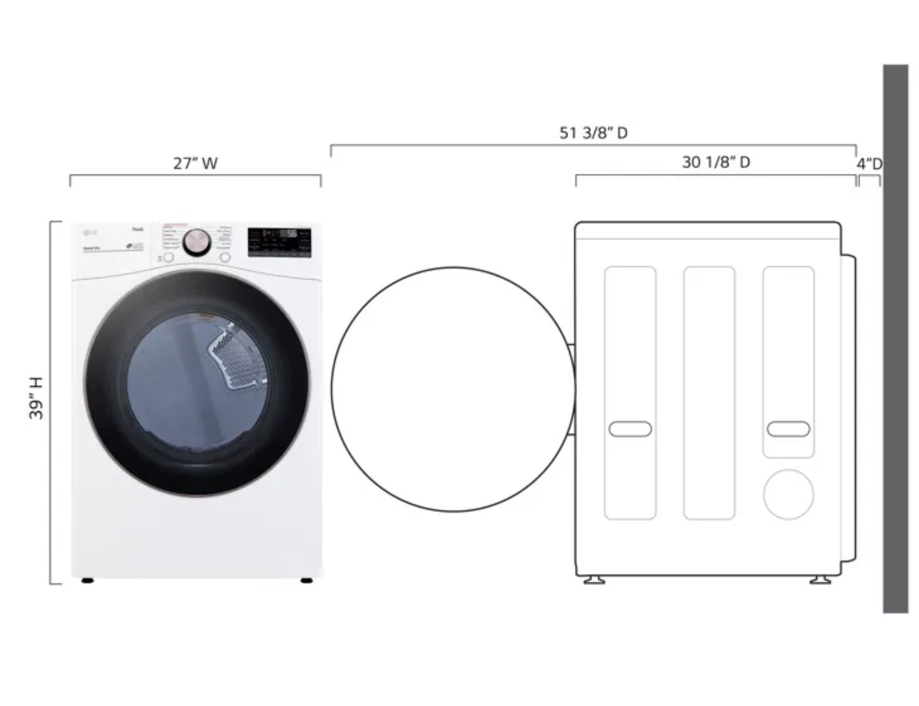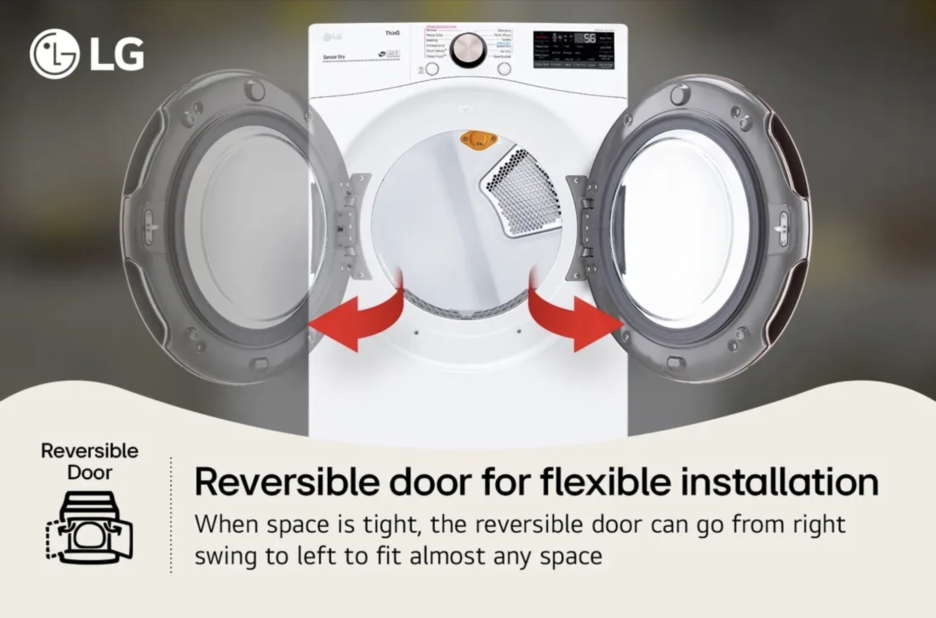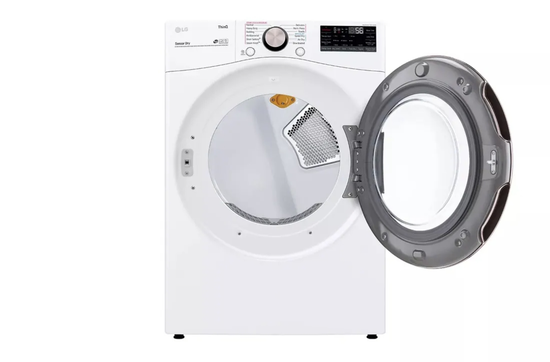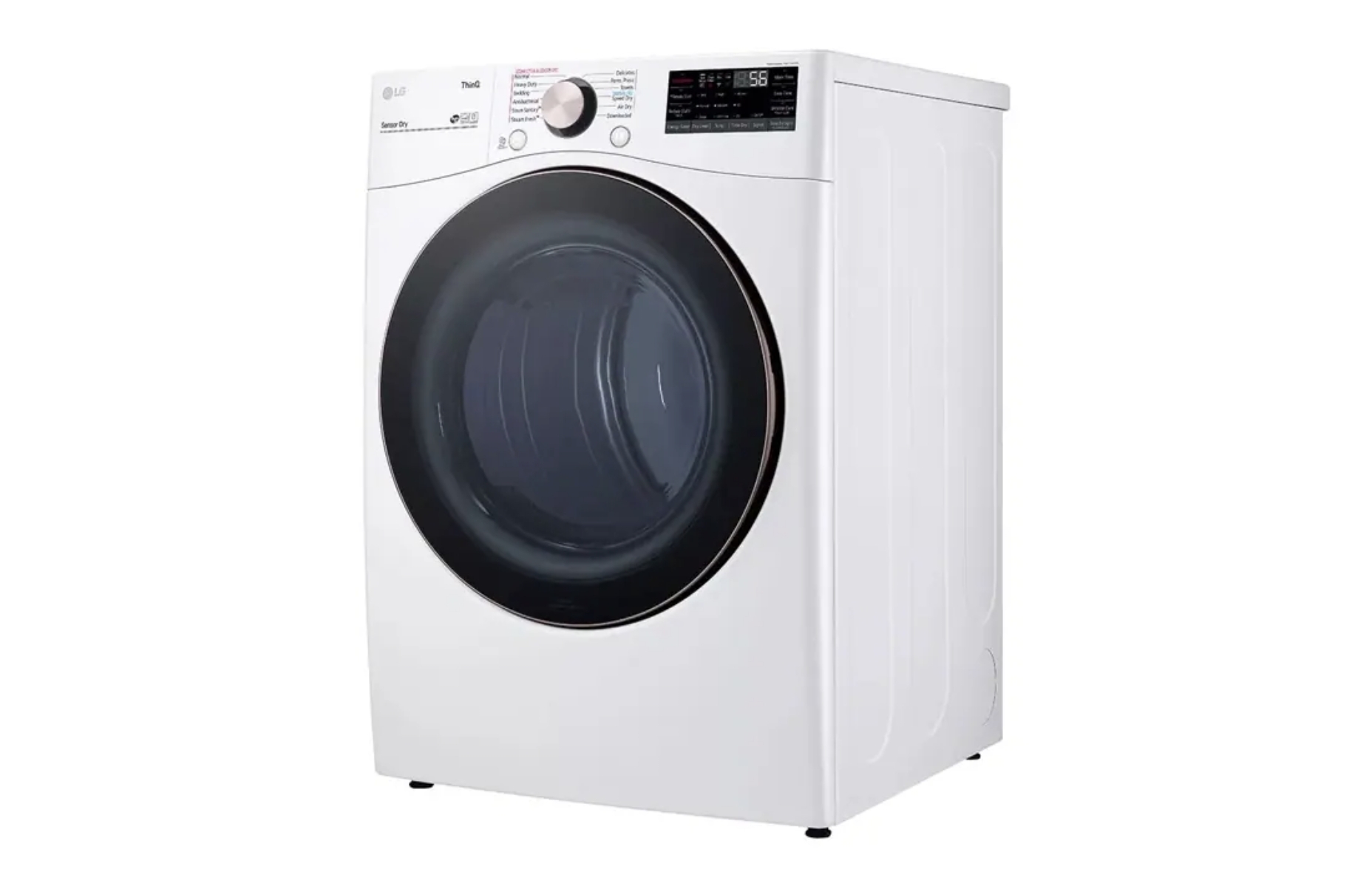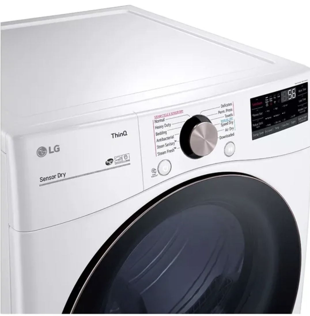 • Options/Features: Damp Dry Signal, Wrinkle Care, More/Less Time, Control Lock, Remote Start, Drum Light, FlowSense™ indicators (lint/duct clog), Energy Saver, Reduce Static, SmartDiagnosis™, Wi-Fi/ThinQ® remote control, TurboSteam®